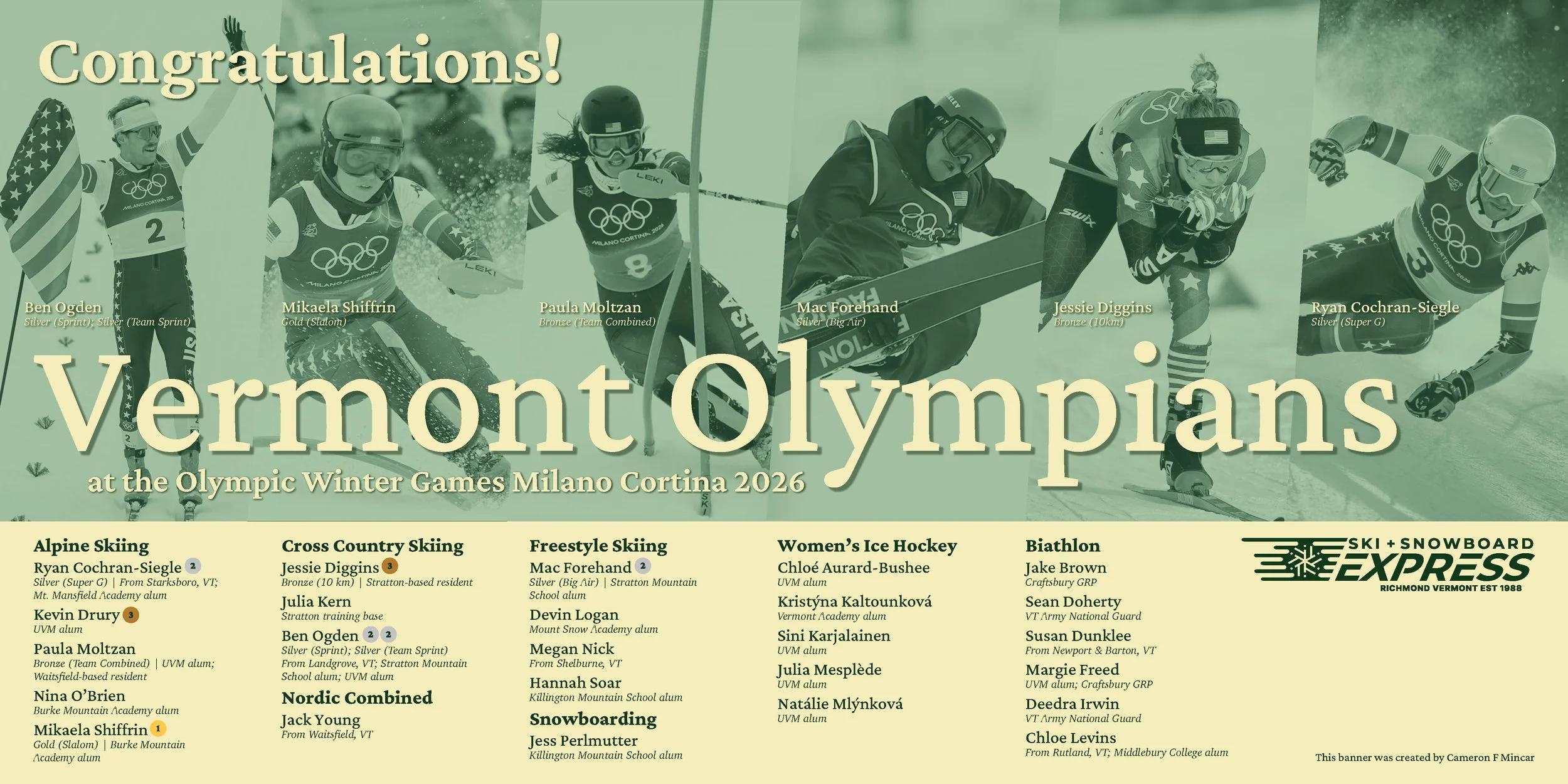 To congratulate Vermont Olympians at the Olympic Winter Games Milano Cortina 2026, Ski + Snowboard Express and I collaborated on a banner for locals and people driving by to see.